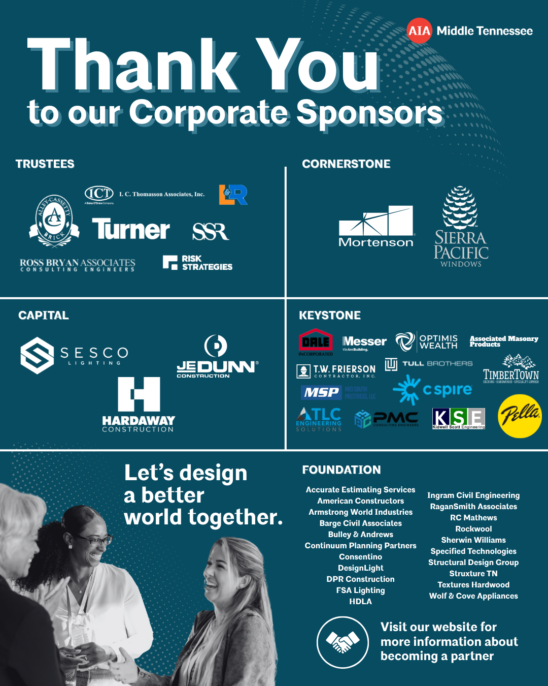 An investment in the AIA Middle Tennessee Corporate Partners Program allows your business to connect with more than 850 AIA Middle Tennessee chapter members.